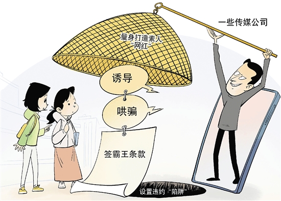 记者调查发现,这家传媒公司先是在网络平台有针对性地“广撒网”,再利用在校大学生不熟悉“网红”行业规则和相关法律条款,诱惑其签约,通过设计不公平的合同内容或进行虚假承诺,导致其陷入法律纠纷。