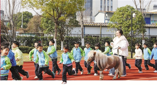 2月19日,杭州东城外国语实验学校的学生们兴高采烈地与小马一起跑步。新学期,该校引进了矮脚马、小羊、小鹿等动物,让学生们和这些可爱的动物一起跑操、玩耍,旨在通过自然教育,让校园时光更加快乐阳光。