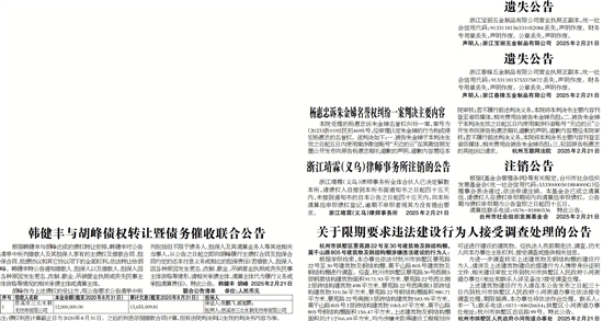 胡峰作为上述债权的受让方,现公告要求公告清单中所列包括但不限于债务人、担保人及其清算业务人等其他相关当事人,从公告之日起立即向胡峰履行主债权合同及担保合同约定的还本付息义务或相应的担保责任(若借款人、担保人因各种原因发生更名、改制、歇业、吊销营业执照或丧失民事主体资格等情形,请相关承债主体、清算主体代为履行义务或承担清算责任)。特此公告。 韩健丰 胡峰 2025年2月21日