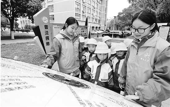 此外,义乌还全面推进青藤法治馆、明法问道基地、宪法广场等校内外法治教育基地建设,利用法治互动教学软件和在线学习平台,多层次引领学生零距离学习法治知识。同时,全新构筑模拟法庭、法治书屋、法治小角等场景,与法治事件、法律问题、现实案例相结合,采用问题驱动、合作体验、分享交流等方式以案说法,让法治的阳光洒满校园。