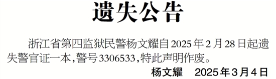 浙江省第四监狱民警杨文耀自2025年2月28日起遗失警官证一本,警号3306533,特此声明作废。