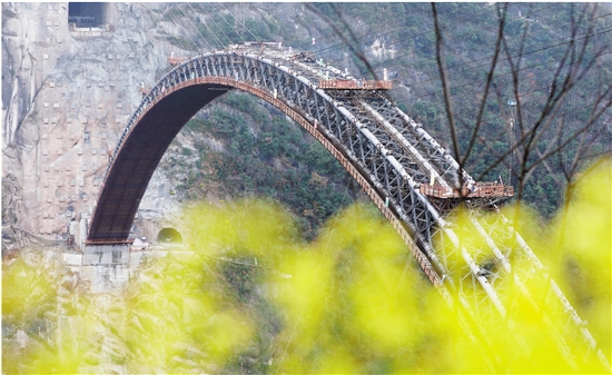 | 3月5日,贵州瓮马铁路南北延伸线项目控制性工程乌江特大桥顺利合龙。乌江特大桥全桥长约520米,主跨337米,桥面至江面高度约200米。 瓮马铁路南北延伸线北起瓮安延伸至遵义,南起马场坪延伸至都匀,全长148公里。 新华社 肖伟 摄 |