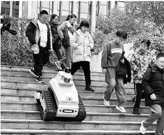 本报讯 3月5日下午,杭州市福山外国语小学内,技术人员正在进行校园巡防机器人的爬坡测试:一台搭载金属履带的银色机器人,像个“小坦克”似的,在台阶上灵活地攀爬。