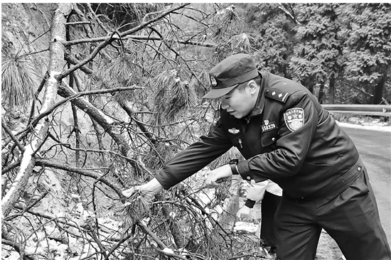 近期,受天气影响,金华山多路段迎来不同程度的降雪。金华市公安局婺城分局罗店派出所生态警长联合生态义警队员闻“雪”而动,加大路面、景点巡逻管控力度,及时发现并清除隐患,确保群众安全出行。 通讯员 朱明月