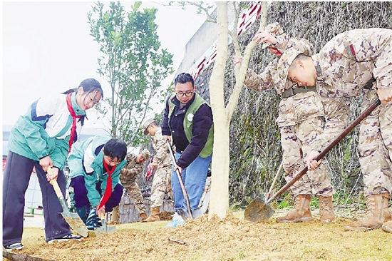 近日,磐安县退役军人事务局组织当地小学生走进武警金华支队,开展植树节主题活动。