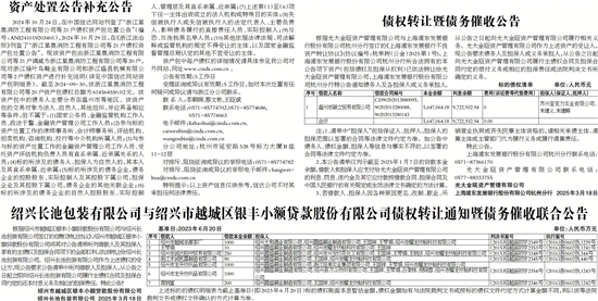 绍兴长池包装有限公司与绍兴市越城区银丰小额贷款股份有限公司债权转让通知暨债务催收联合公告