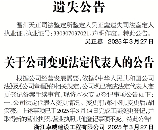 温州天正司法鉴定所鉴定人吴正鑫遗失司法鉴定人执业证,执业证号:330307037021,声明作废。特此公告。 吴正鑫 2025年3月27日
