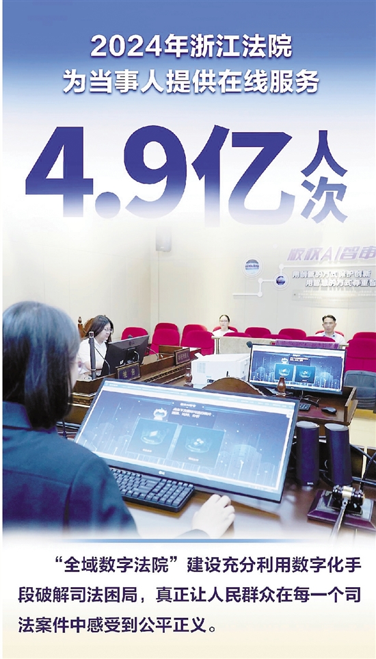 立案“不打烊”、审案“走云端”、执行“网上见”。10余年的互联网司法探索最终浓缩成一份“数字答卷”——2024年,全省法院为当事人提供在线服务4.9亿人次;最高法院总结、推广浙江经验,以浙江“全域数字法院”为基础建设全国法院“一张网”;浙江智慧法院综合指数连续4年全国第一。