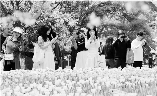3月26日下午,杭州太子湾公园郁金香与樱花竞相绽放,吸引众多游客前来赏花。