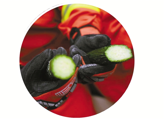 一切准备就绪,实验正式开始。两名全副武装的消防员骑上电动自行车,后座的消防员手持黄瓜“撞向”风筝线。黄瓜在接触到风筝线的瞬间被切成两段,截面十分光滑,这说明风筝线在切割过程中非常锋利。
