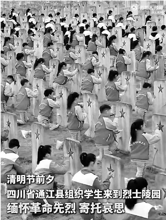 清明前夕,四川通江县组织学生来到烈士陵园,孩子们为烈士墓碑献花、描红,缅怀先烈,寄托哀思。