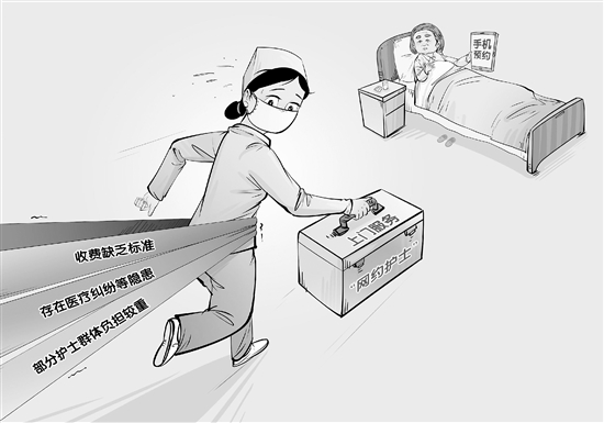 | 新华社 曹一 作 近年来,手机预约、上门服务的“网约护士”在多地出现。随着我国人口老龄化程度加深、多样化健康需求增加,居家护理服务成为失能、半失能老人和行动不便患者的刚需。 记者调查发现,面对潜在的巨大社会需求,“网约护士”推广还存在一些现实困难。 ——收费缺乏标准。现在,“网约护士”收费多为医院或平台根据当地情况自主确定。 ——存在医疗纠纷等隐患。采访中,有护士担心,患者家庭不具备相关硬件条件,上门护理操作不易,容易产生医患纠纷。 ——部分护士群体负担较重。记者了解到,多地的“网约护士”大多利用业余时间上门服务,部分大医院的护士医疗负担较重,积极性不高。 |