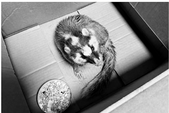 考虑到鼬獾属于国家级保护动物,且受了伤,民警计划在“零伤害”的情况下将其捕捉后进行救助。通过简单布置,一名民警手持捕蛇夹将食物放置于鼬獾面前诱食吸引其注意,另一名民警用网兜推进捕捉。将其成功捕捉后,民警随即用绷带对鼬獾的受伤部位进行简易包裹,并找来空箱子为其搭建了临时小屋,还根据其饮食习惯寻找食物进行喂食。