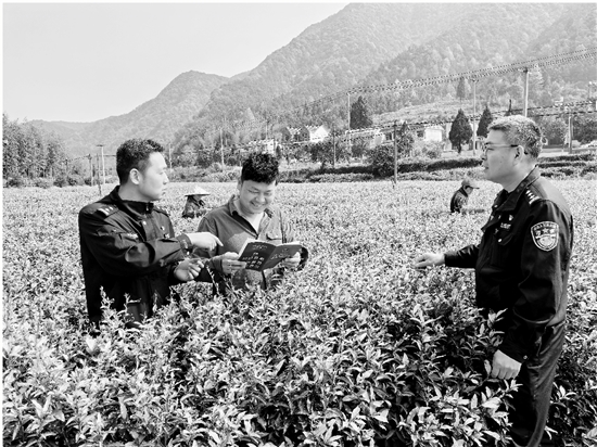 近日,建德市乾潭镇平安法治办联合乾潭派出所、司法所和妇联,深入茶山、地头、加工点,开展“采茶季平安专项行动”,通过“接地气、零距离”的宣传方式,宣讲反诈骗、反邪教、禁种铲毒等知识。 通讯员 陈新