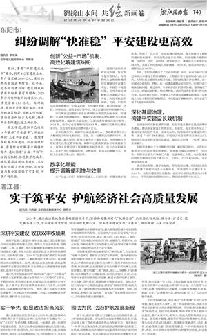 通过创新机制、数字化赋能、深化基层治理,东阳政法系统成功构建了矛盾纠纷多元化解体系,有效提升平安建设水平。2024年,东阳市建筑纠纷化解数、成功率分别同比增长28.4%和36.5%,平均化解时间缩短52.8%,挽回经济损失7.18亿元。