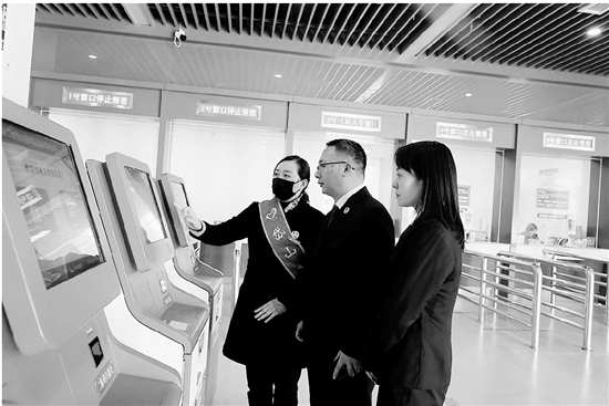 竹屿码头工作人员向回访的检察官演示残疾人优惠购票操作流程