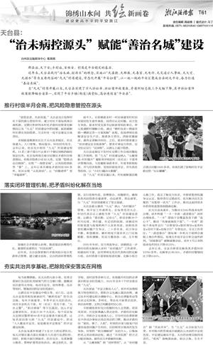 近年来,天台县践行“治未病、控源头”的理念,实施以“无盗抢、无邪教、无毒害、无电诈、无交通亡人事故、无火灾、无溺水”等为主要内容的“九无”村居建设,常态化开展“平安扫雷”,以一地一域的平安汇聚成全县的大平安,奋力打造“善治名城”。