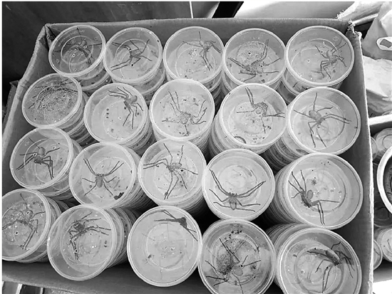 江西抚州的阿辉是淘宝店铺“白额高脚蛛基地”的店主,8年前他开了这家网店,目前是同类商品里销量最高的店铺。每年入春天气暖和后,阿辉每周都从县城驱车到乡下的村子捕捉白额高脚蛛。一般晚上8点出发,次日凌晨返回。“这些蜘蛛多在乡下的老房子附近活动,晚上戴着头灯,灯光照在房墙上,远远就能看到它们。运气好的话,一晚上能捉上百只,有时四五十只。”