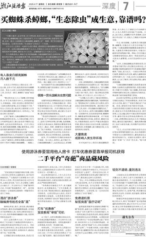 浙江法治报 深度 00007 买蜘蛛杀蟑螂,“生态除虫”成生意,靠谱吗? 2025-04-17 浙江法治报2025-04-1700007;27418393;27418391| 2 2025年04月17日 星期四