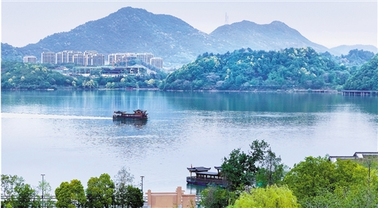 4月17日,杭州市临安区青山湖景区,清澈碧透的山水间,游客乘坐古典画舫畅游青山湖。春风吹拂下的青山湖,湖光山色两相宜,展现出一幅宁静而美丽的自然景观。