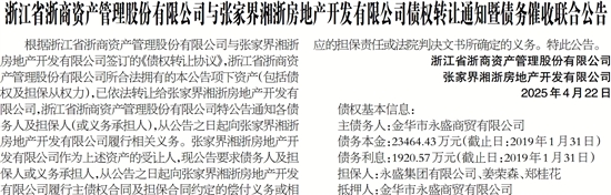 浙江省浙商资产管理股份有限公司与张家界湘浙房地产开发有限公司债权转让通知暨债务催收联合公告