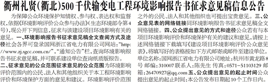 衢州礼贤(衢北)500千伏输变电工程环境影响报告书征求意见稿信息公告