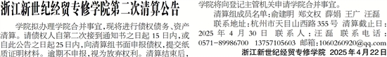 学院拟办理学院合并事宜,现将进行债权债务、资产清算。请债权人自第二次接到通知书之日起 15 日内,或自此公告之日起25日内,向清算组书面申报债权,提交纸质证明材料。逾期不申报,视为放弃权利。清算结束后,学院将向登记主管机关申请学院合并事宜。