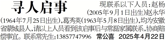 现联系以下人员:赵杨(2005年9月1日出生)赵永华(1964年7月25日出生),葛秀英(1963年5月8日出生),均为安徽省蒙城县人,请以上人员看到该启事后与常磊家属联系,协商赔偿事宜。联系常先生:13857747996 常公喜 2025年4月22日