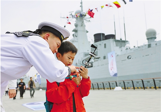 | 4月22日,一个小朋友在海军战士指导下体验使用三杯风向风速仪。 当日,在人民海军成立76周年之际,驻沪海军部队联合上海市双拥办共同组织以“上海·海上”为主题的舰艇开放活动。两艘海军现役主战舰艇综合登陆舰沂蒙山舰和导弹驱逐舰西安舰靠泊上海港国际客运中心码头,市民游客不仅能够登舰参观,还在现场观看和参与文艺表演和国防教育科普活动。 新华社 方喆 摄 |
