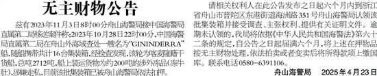 请相关权利人在此公告发布之日起六个月内到浙江省舟山市普陀区东港街道海洲路351号舟山海警局认领该批集装箱并接受调查、主张权利、提供有关证明文件。逾期未认领的,我局将依据《中华人民共和国海警法》第六十二条的规定,自公告之日起届满六个月,将上述在押物品按无主财物处理,依法拍卖或者变卖后将所得款项上缴国库。联系电话0580-6391106。