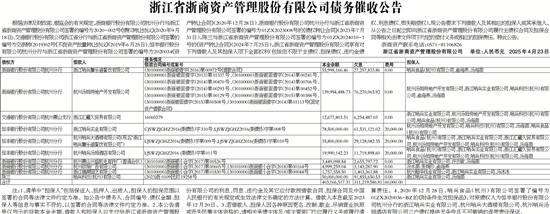 根据法律及财政部、银监会的有关规定,浙商银行股份有限公司杭州分行与浙江省浙商资产管理股份有限公司签署的编号为2020-002号《债权转让协议》(2020年9月18日)、交通银行股份有限公司浙江省分行与浙江省浙商资产管理股份有限公司签署的编号为交浙转(2019)02号《不良资产批量转让协议》(2019年6月25日)、恒丰银行股份有限公司杭州分行与浙江省浙商资产管理股份有限公司签署的编号为2020034《资产转让合同》(2020年12月28日)、浙商银行股份有限公司杭州分行与浙江省浙商资产管理股份有限公司签署的编号为01ZX2023008号的《债权转让合同》(2023年7月31日),陈兰与浙江省浙商资产管理股份有限公司签署的编号为01ZX2024010-1号的《资产转让合同》(2024年7月25日),浙江省浙商资产管理股份有限公司享有对下列借款人及其担保人项下全部权利(包括但不限于主债权、担保债权、违约金债权、利息债权、损失赔偿权),现公告要求下列借款人及其相应的担保人或其承继人,从公告之日起立即向浙江省浙商资产管理股份有限公司履行主债权合同及担保合同等相关法律文件项下约定的偿付义务或相应的担保责任。特此公告。