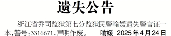 浙江省乔司监狱第七分监狱民警喻媛遗失警官证一本,警号:3316671,声明作废。 喻媛 2025年4月24日
