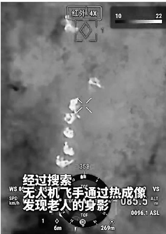 虽然山林面积辽阔、草木丛生为搜救带来了不小的挑战,但大家紧绷神经,不放过任何线索。搜救30个小时后,“鱼鹰战队”飞手突然发现异常——热成像屏幕上一个微弱的“红点”在闪烁!镜头拉近,老人正蜷缩在陡坡下的隐蔽处,看起来体力耗尽、无法动弹。