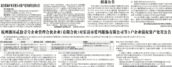 杭州浙珏贰拾壹号企业管理合伙企业(有限合伙)拟对从浙江浙栋资产管理有限公司收购的乐清市爱玛服饰有限公司等3户企业债权资产进行处置,拟以公开竞价或协议转让等方式进行,现予以公告。