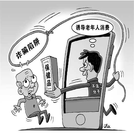 | 市场监管总局和中国消费者协会近日联合发布防范“保健品”诈骗老年人消费提示,提醒老年消费者增强风险防范意识,远离诈骗陷阱。 当前,一些不法经营者炒作“保健品”概念,通过低价旅游、免费讲座、免费鸡蛋以及“包治百病”等形式,设置套路与陷阱,对产品作虚假或引人误解的宣传,诱导老年人消费。 新华社 徐骏 作 |