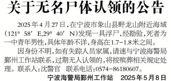 因身份不明,如有失踪人员家属,请速与宁波海警局鄞州工作站联系,过期无人认领的,将按殡葬相关规定处理。联系人:沈警官 联系电话:0574-86180607。