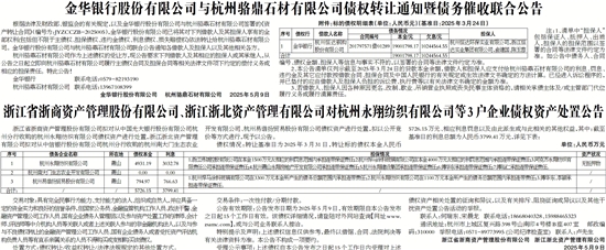 根据法律及财政部、银监会的有关规定,以及金华银行股份有限公司与杭州骆鼎石材有限公司签署的《资产转让合同》(编号为:JYZCCZB-2025005),金华银行股份有限公司已将其对下列借款人及其担保人享有的全部权利(包括但不限于主债权、担保债权、违约金债权、利息债权、损失赔偿权)依法转让给杭州骆鼎石材有限公司。金华银行股份有限公司与杭州骆鼎石材有限公司联合公告通知各借款人及担保人以及其他相关各方。