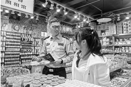 近日,温州龙湾公安永中派出所民警张后畏走进辖区寺前街,穿梭于古色古香的商铺间,以真实案例为引,用方言俚语拆解网络刷单、冒充客服等诈骗套路,为古街商户织密反诈“安全网”。 通讯员 陈思伊 摄