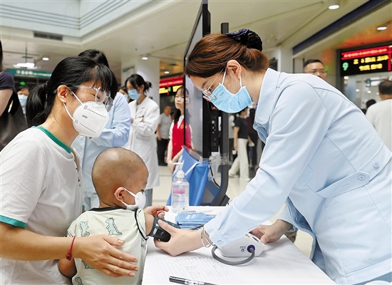 | 5月8日,在广西医科大学第一附属医院,医务人员在义诊现场提供测量血压服务。 当日是世界地贫日,广西医科大学第一附属医院开展义诊活动,为地中海贫血患者及其家属提供咨询诊疗服务,并宣传地贫防控知识。 新华社 陆波岸 摄 |