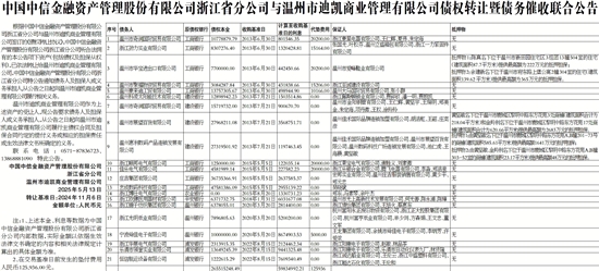 根据中国中信金融资产管理股份有限公司浙江省分公司与温州市迪凯商业管理有限公司签订的《债权转让协议》,中国中信金融资产管理股份有限公司浙江省分公司所合法拥有的本公告项下资产(包括债权及担保从权利),已依法转让给温州市迪凯商业管理有限公司,中国中信金融资产管理股份有限公司浙江省分公司特公告通知债务人及担保人或义务承担人,从公告之日起向温州市迪凯商业管理有限公司履行相关义务。