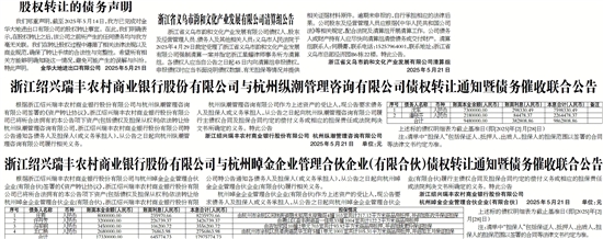 根据浙江绍兴瑞丰农村商业银行股份有限公司与杭州晫金企业管理合伙企业(有限合伙)签署的《资产转让协议》,浙江绍兴瑞丰农村商业银行股份有限公司已将所合法拥有的本公告项下资产(包括债权及担保从权利)依法转让给杭州晫金企业管理合伙企业(有限合伙),浙江绍兴瑞丰农村商业银行股份有限公司特公告通知各债务人及担保人(或义务承担人),从公告之日起向杭州晫金企业管理合伙企业(有限合伙)履行相关义务。
