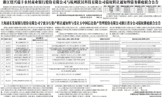 根据浙江绍兴瑞丰农村商业银行股份有限公司与杭州跃汉科技有限公司签署的《资产转让协议》,浙江绍兴瑞丰农村商业银行股份有限公司已将所合法拥有的本公告项下资产(包括债权及担保从权利)依法转让给杭州跃汉科技有限公司,浙江绍兴瑞丰农村商业银行股份有限公司特公告通知各债务人及担保人(或义务承担人),从公告之日起向杭州跃汉科技有限公司履行相关义务。