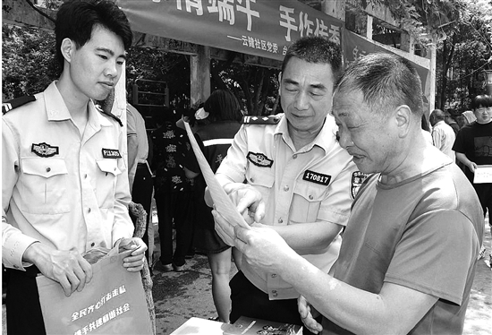 近日,台州椒江公安白云派出所民警开展了一场端午反诈宣传活动,为辖区居民送上节日祝福的同时,也为他们筑起了一道坚实的反诈“防火墙”。