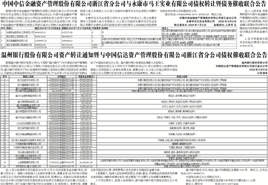 温州银行股份有限公司资产转让通知暨与中国信达资产管理股份有限公司浙江省分公司债权催收联合公告