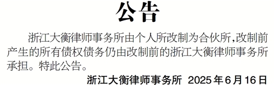 浙江大衡律师事务所由个人所改制为合伙所,改制前产生的所有债权债务仍由改制前的浙江大衡律师事务所承担。特此公告。