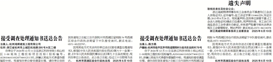 因用其他方式无法向你单位送达《接受调查处理通知书》,根据《中华人民共和国行政处罚法》第六十一条第一款、《中华人民共和国民事诉讼法》第九十五条的规定,现向你单位公告送达。此公告之日起,经过三十日即视为送达。 杭州市西湖区综合行政执法局 2025年6月19日