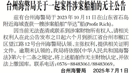 因当前无法查清或联系到涉案财物所有权人,请相关权利人在此公告发布之日起六个月到浙江省台州市椒江区望江路12号台州海警局认领、主张权利,提供相关证明文件。逾期未认领的,我局将依据《中华人民共和国海警法》第六十二条之规定,将上述船舶作无主财物认定,并依法上缴国库。联系电话:0576-88483061/88483069。