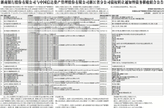 浙商银行股份有限公司与中国信达资产管理股份有限公司浙江省分公司债权转让通知暨债务催收联合公告