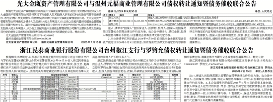 根据相关法律规定,以及浙江民泰商业银行股份有限公司台州椒江支行与罗钧允签署的《债权转让合同》(签署日期2025年06月30日),浙江民泰商业银行股份有限公司台州椒江支行特此将下表所列沈光辉、郭庆、张文忠、赵海债权资产及相关权益转让的事实通知与该等债权及相关权益有关的借款人、物权担保人和/或保证人、法院判决与裁定确定的责任人及其他相关当事人及其各自的承继人(“下称义务人”)。