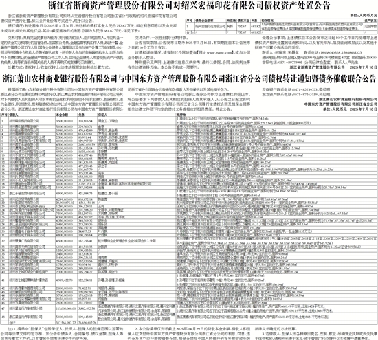 根据浙江萧山农村商业银行股份有限公司与中国东方资产管理股份有限公司浙江省分公司签署的《债权转让协议》,浙江萧山农村商业银行股份有限公司已将其对下列借款人及其担保人项下享有的全部权利(包括但不限于主债权、担保债权、违约金债权、利息债权、损失赔偿权)依法转让给中国东方资产管理股份有限公司浙江省分公司。浙江萧山农村商业银行股份有限公司与中国东方资产管理股份有限公司浙江省分公司联合公告通知各借款人及担保人以及其他相关各方。